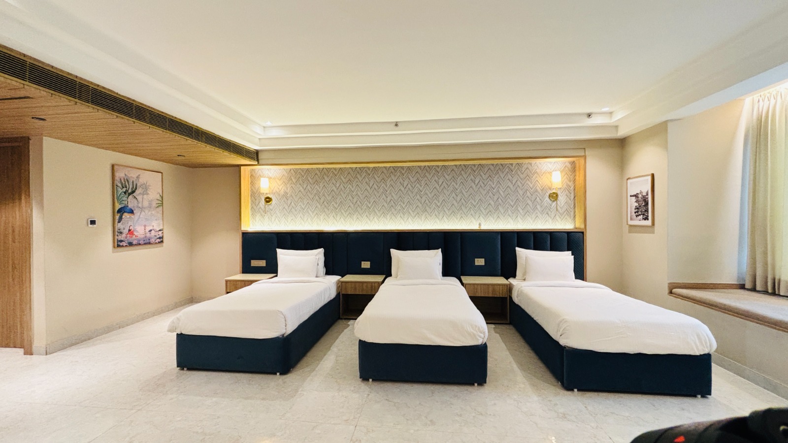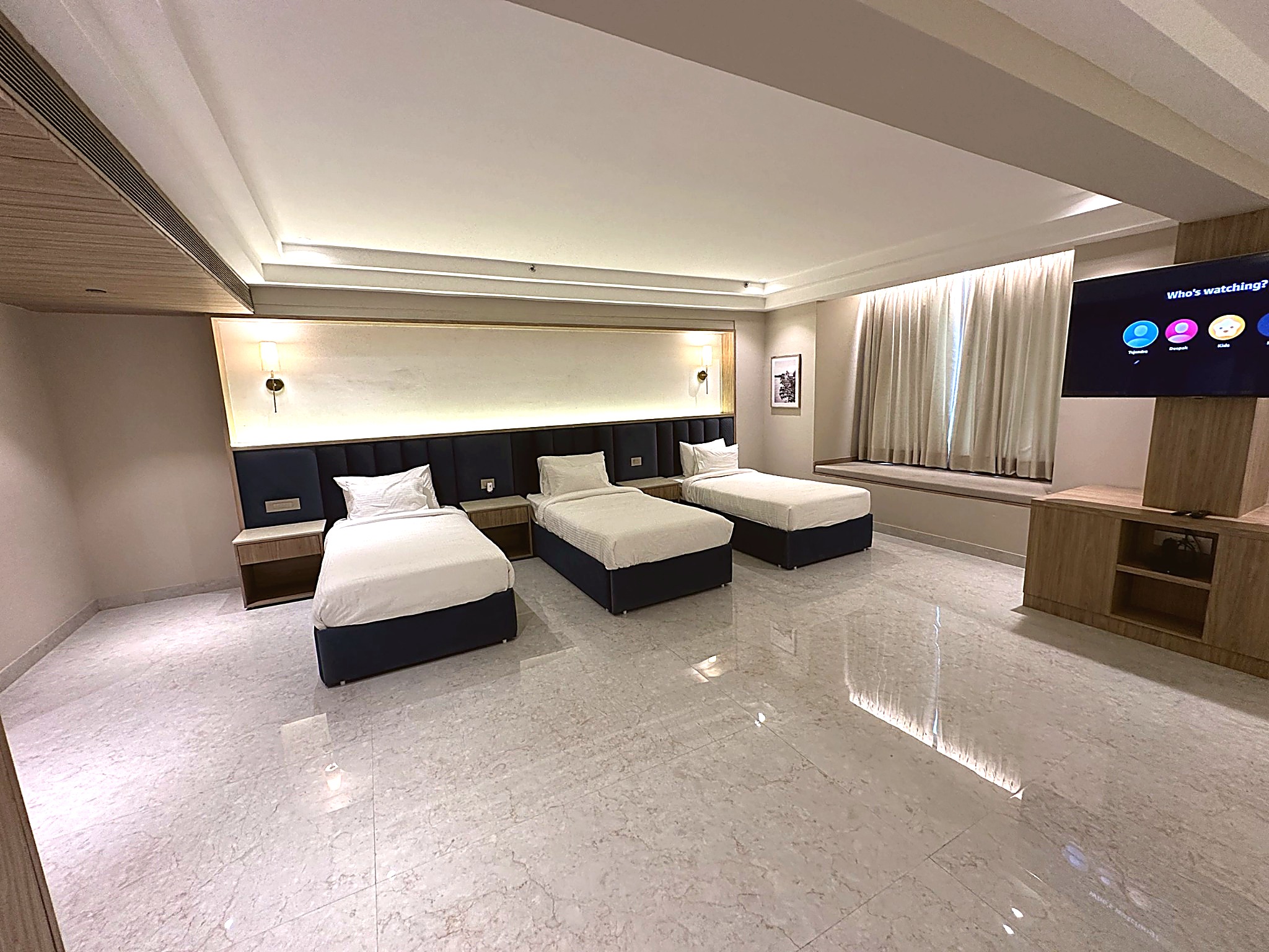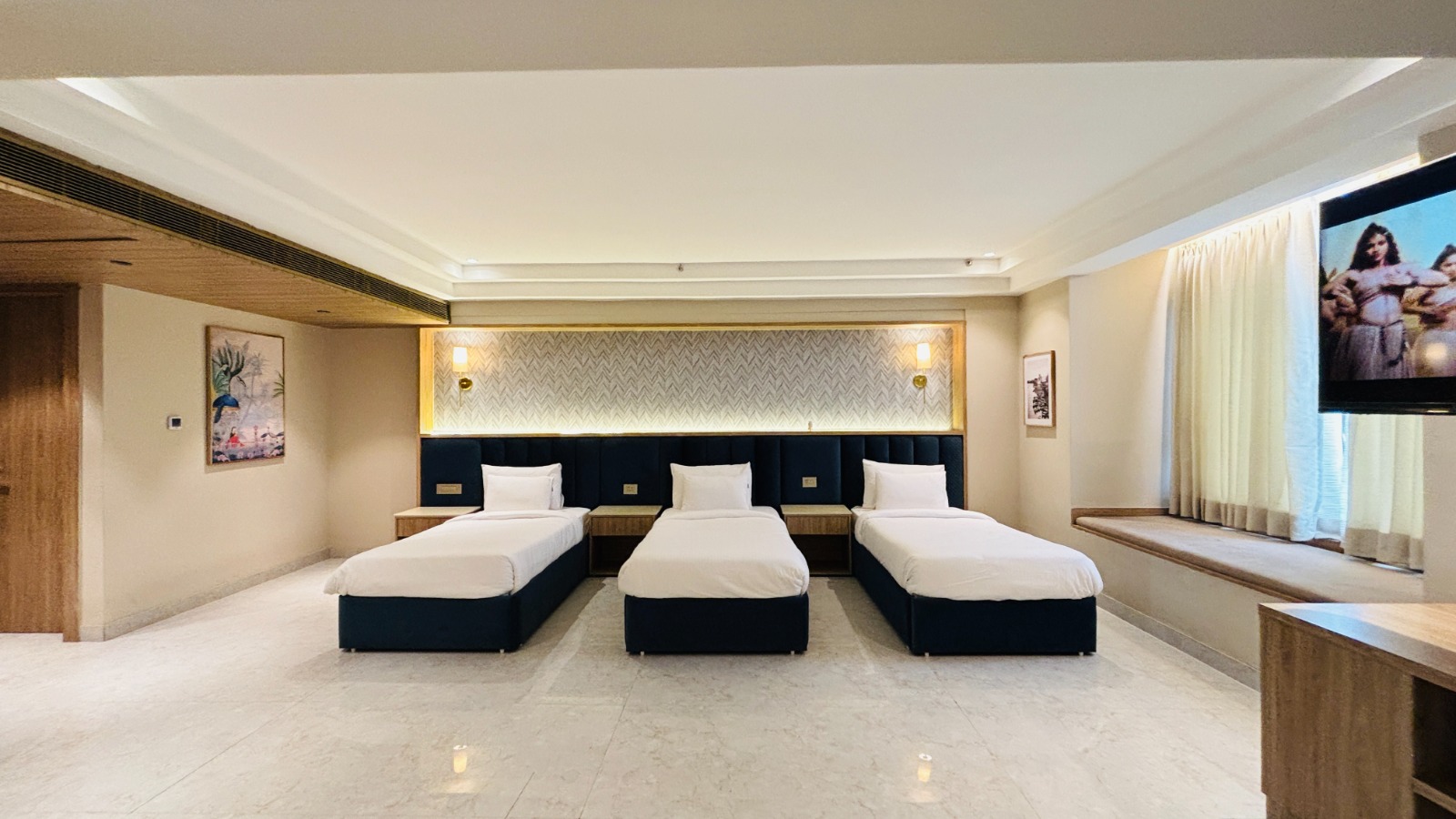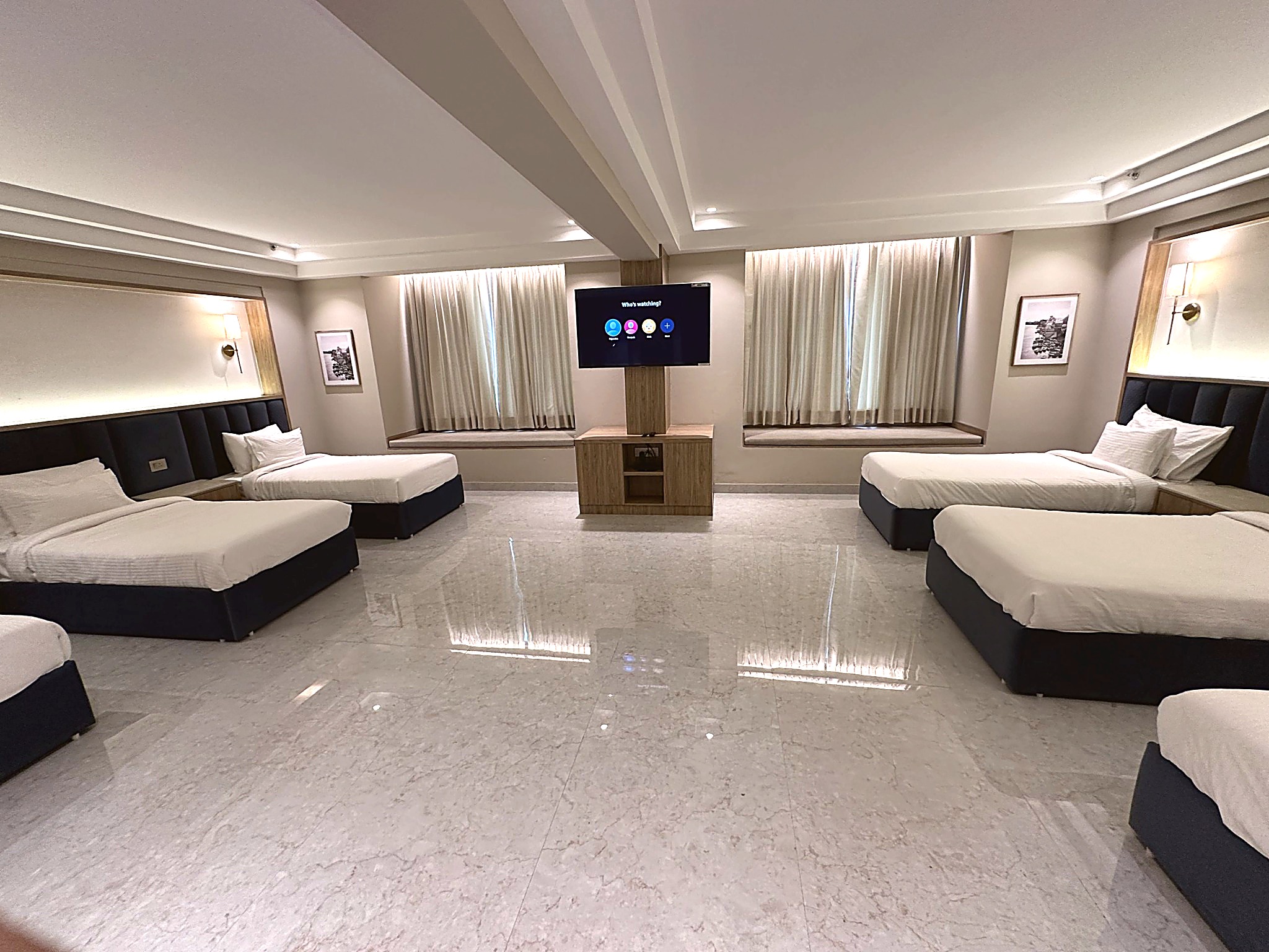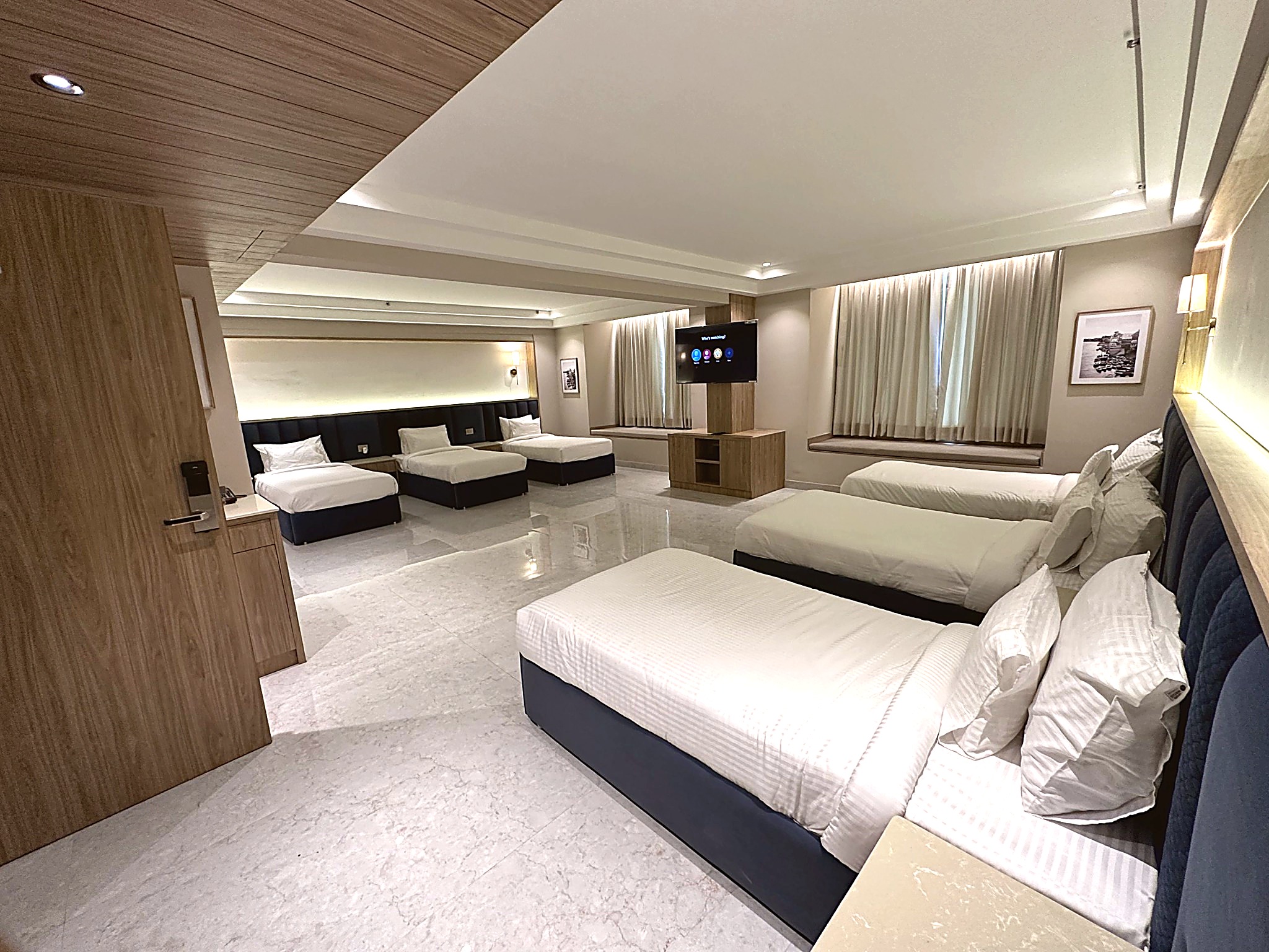Welcome to our expansive Family Suite at Sri Vrinda Heritage, designed for families seeking comfort and togetherness. This generously sized suite features six comfortable beds, making it perfect for larger groups or families. With a cozy living area and elegant decor, the suite offers ample space for relaxation and bonding. Enjoy modern amenities including a flat-screen TV, high-speed Wi-Fi, and a private bathroom equipped with premium toiletries. Create unforgettable memories as you gather in this spacious retreat, where every family member can unwind and feel at home in the heart of Vrindavan.