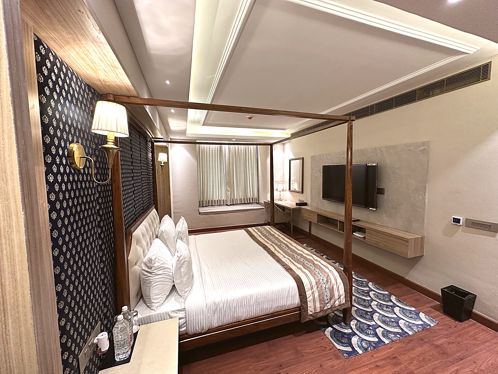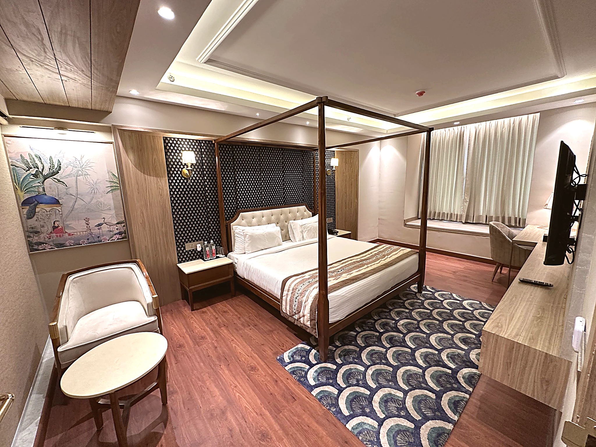 Indulge in the epitome of elegance and comfort in our Luxurious Suite Room at Sri Vrinda Heritage. This opulent suite features a spacious layout with a beautifully designed living area, a plush king-sized bed, and sophisticated furnishings that exude luxury. Enjoy stunning views of the vibrant surroundings while relaxing in the comfortable seating area or unwinding in the well-appointed bathroom with premium amenities. With modern conveniences like a flat-screen TV, high-speed Wi-Fi, and a minibar, every detail is crafted to enhance your stay. Perfect for a romantic getaway or a lavish retreat, our Luxurious Suite Room promises an unforgettable experience in the heart of Vrindavan.